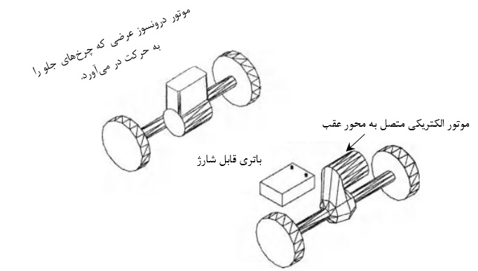 شکل 4: خودروی هیبریدی با چیدمان موازی که موتور احتراق داخلی روی محور جلو و موتور الکتریکی روی محور عقب است.